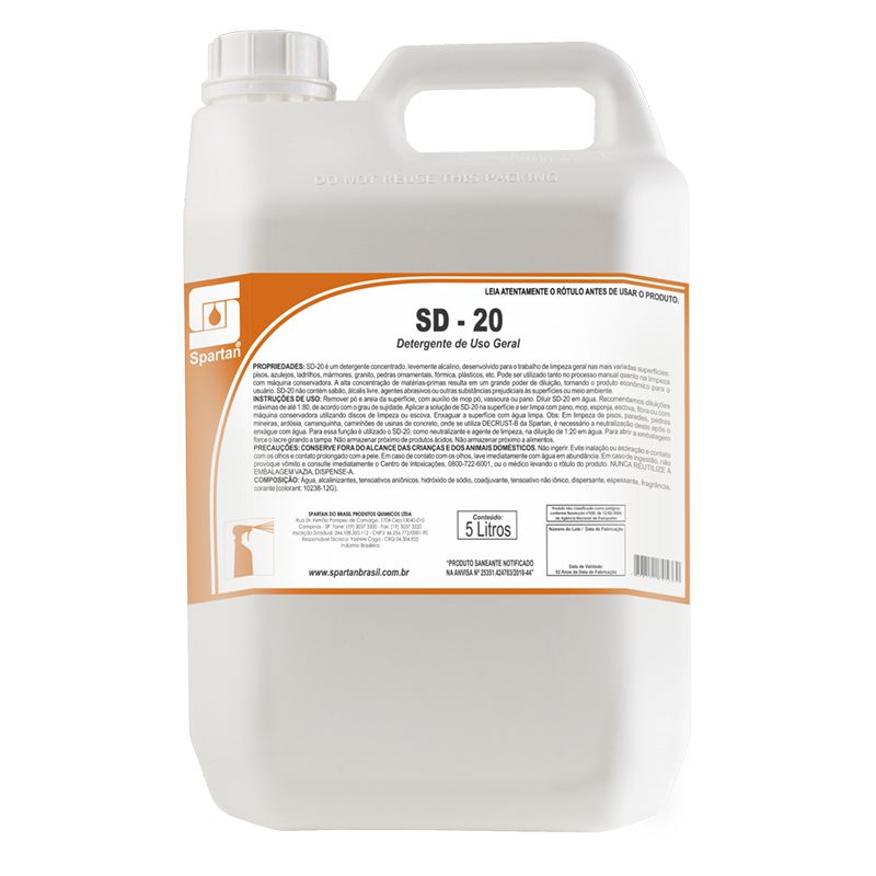 SD-20 é um detergente concentrado, levemente alcalino, desenvolvido para o trabalho de limpeza geral nas mais variadas superfícies: pisos, azulejos, ladrilhos, mármores, granito, pedras ornamentais, fórmica, plásticos, etc.